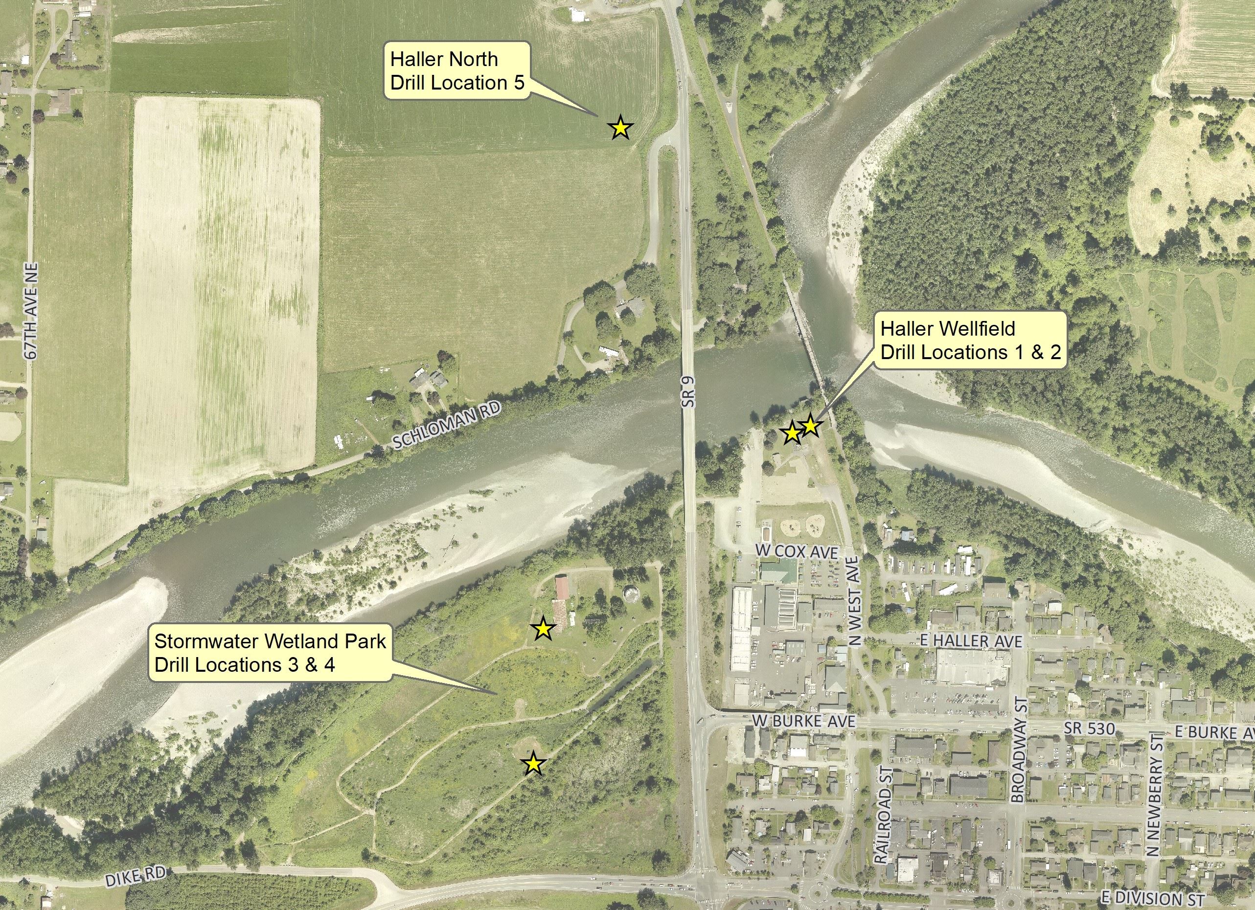 The City of Arlington has been preparing to expand its water supplies due to the continued and projected growth of the Arlington area. The City drilled five test wells in the Stillaguamish River area to locate new potential production wells. The project will included five drilling sites: two at Haller Park by the existing wells, two in the Stormwater Wetland Park area, and one on the north side of the river.