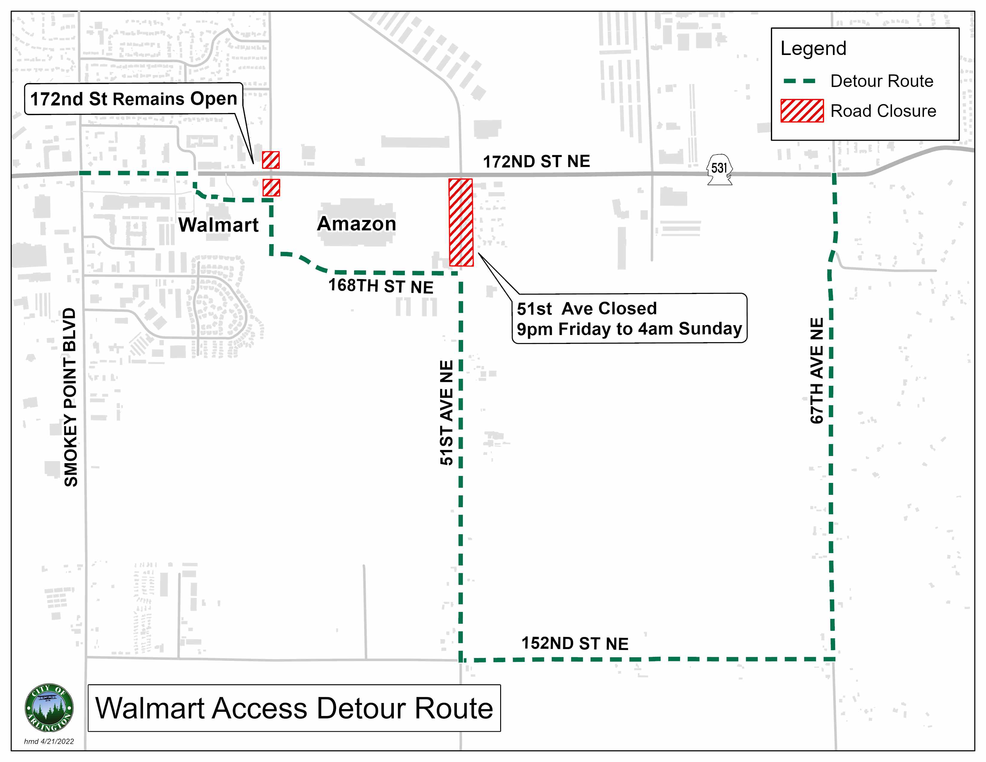 - September 30, 2022 - The roundabout is scheduled to be open by Monday, October 3rd in the morning. Next week work will include center island landscaping. Construction is scheduled to occur Monday-Friday from 6:00 AM to 6:00 PM. Beginning on October 3rd, 168th St NE from 51st Ave to 43rd Ave will be closed to public access while the contractor performs final roadway improvements. This work is estimated to be complete by October 22nd and the roadway is to reopen on Sunday, October 23rd. Please use 172nd St to access 43rd Ave, the roundabout will be open by Monday, October 3rd in the morning prior to any closure of 168th St.