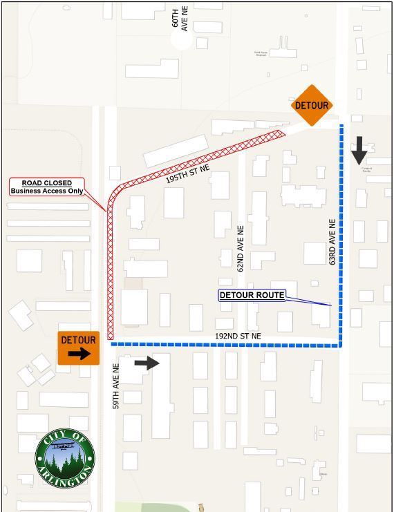 59th Avenue and 195th Street NE will be closed to through traffic from north of 192nd to 63rd Avenue for a water main replacement this week.