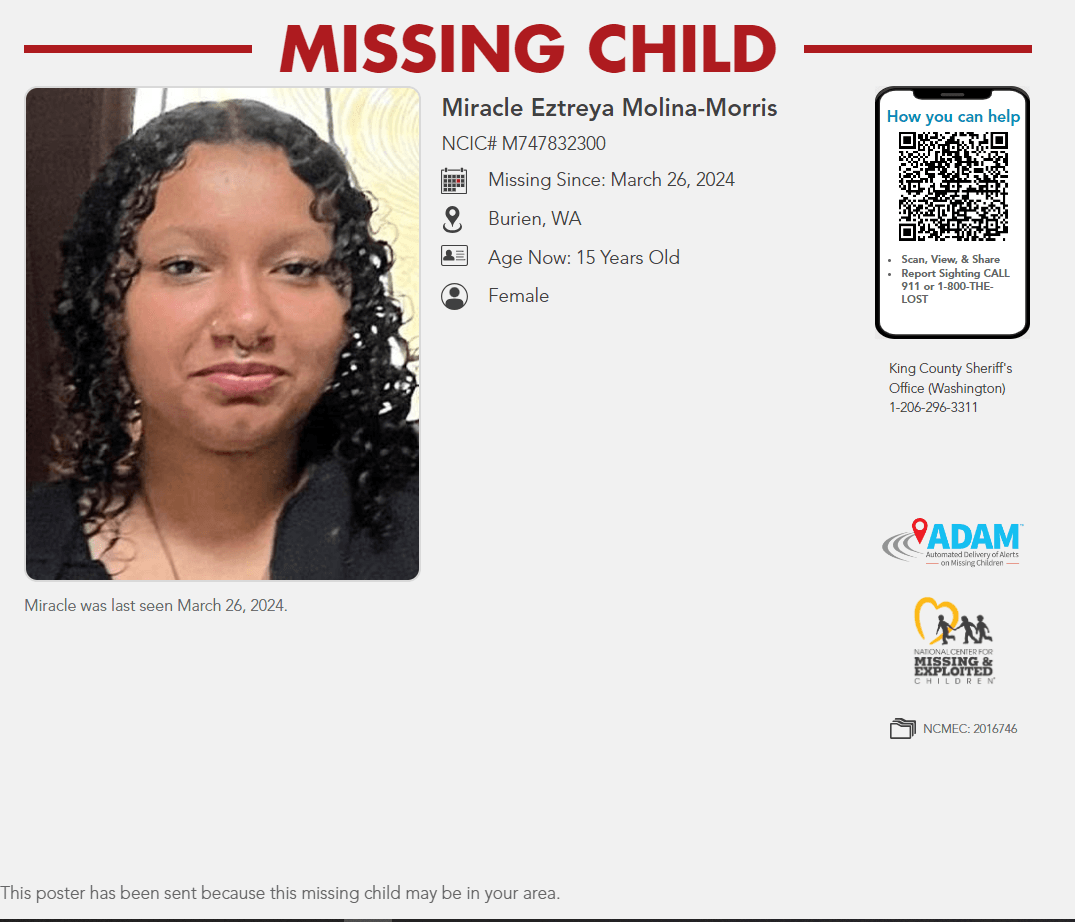 Our Arlington Police Department patrol officers received a notification that Miracle Eztreya Molina-Moris, a 15-year-old missing juvenile from Burien, might be in the Arlington area.
